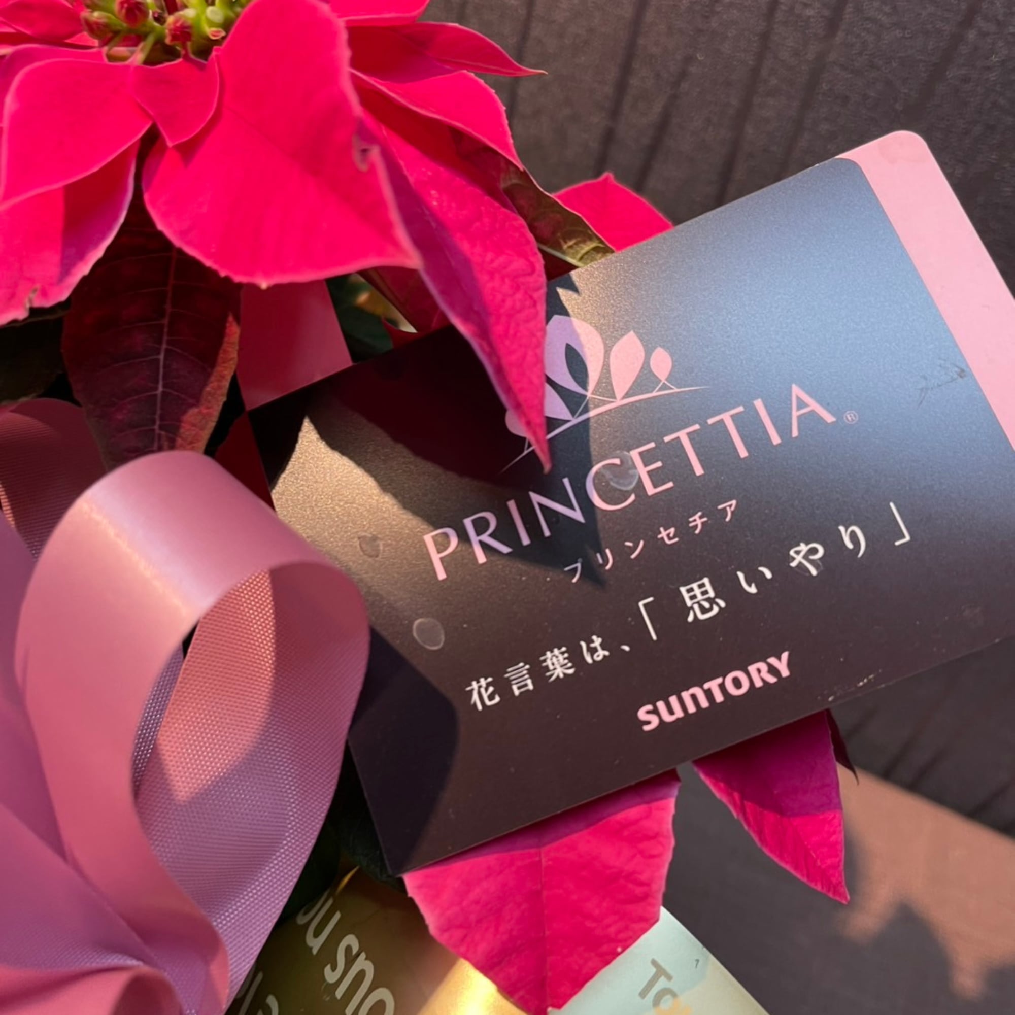 ・プリンセチアはポインセチアと同じユーフォルビアの仲間。ピンク色の方が特徴で、上品で、可愛らしい色合。華やかなな雰囲気。花言葉は「思いやり」。冬のギフトに人気の鉢物です!バスケット入り