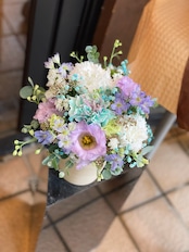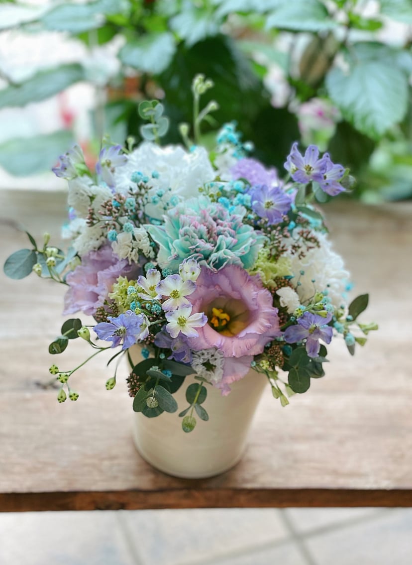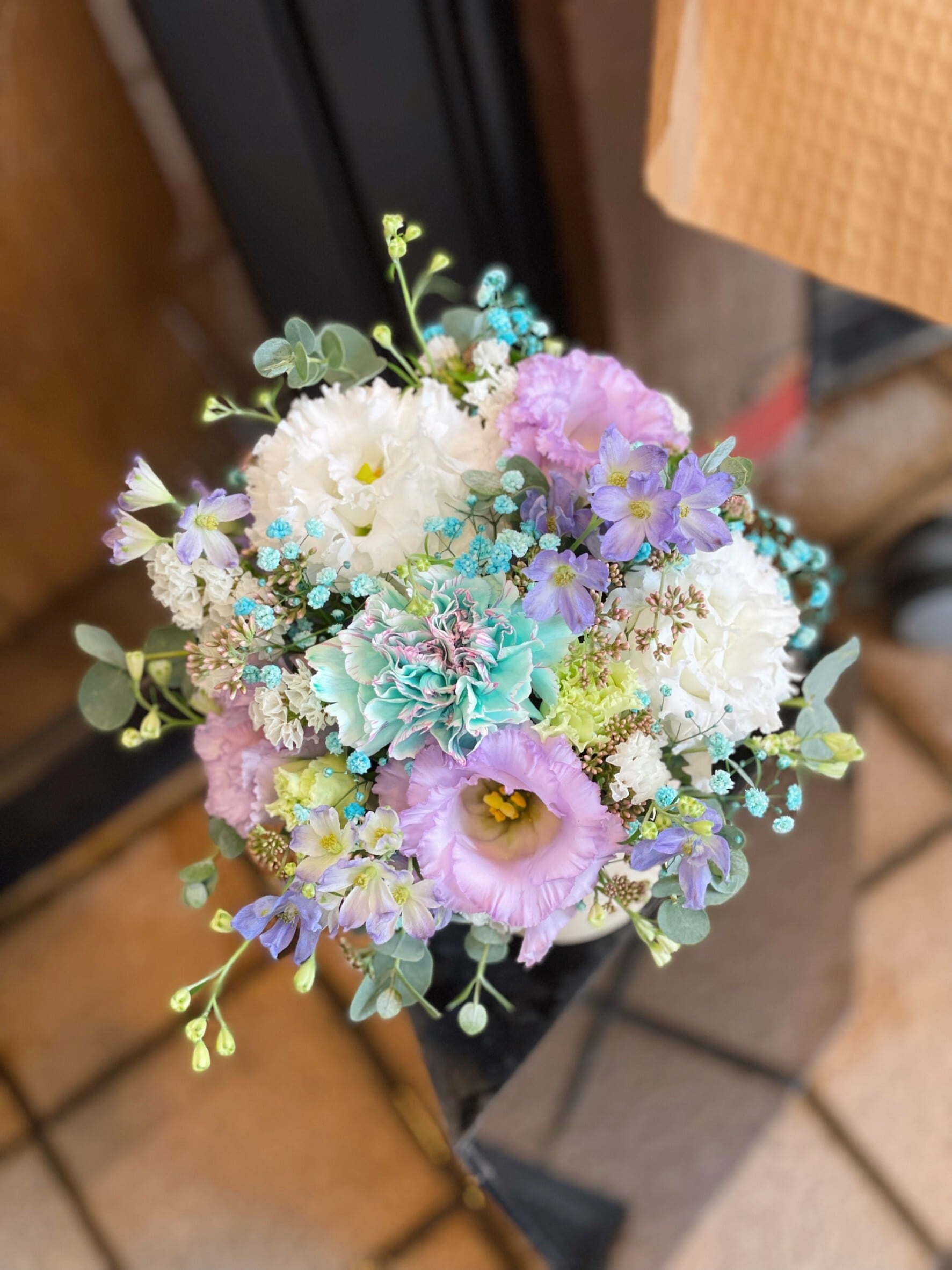 パステル調の優しい色合い。ブルーのかすみ草やカーネーション。パープルのトルコキキョウなどで合わせたアレンジメント。