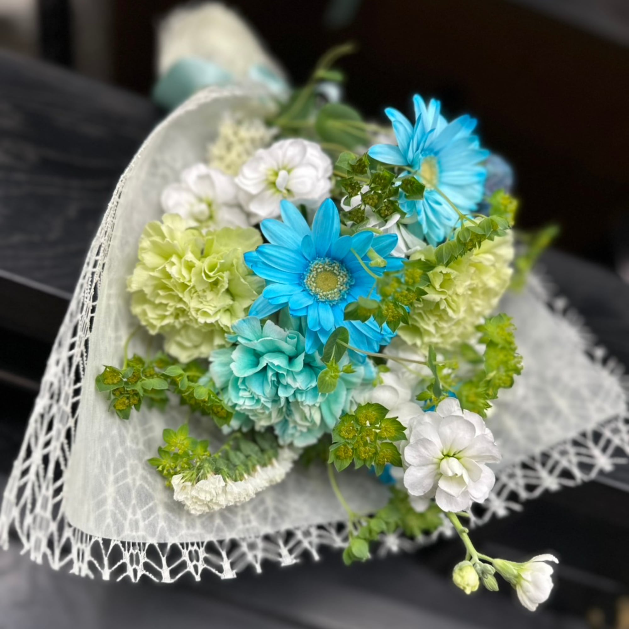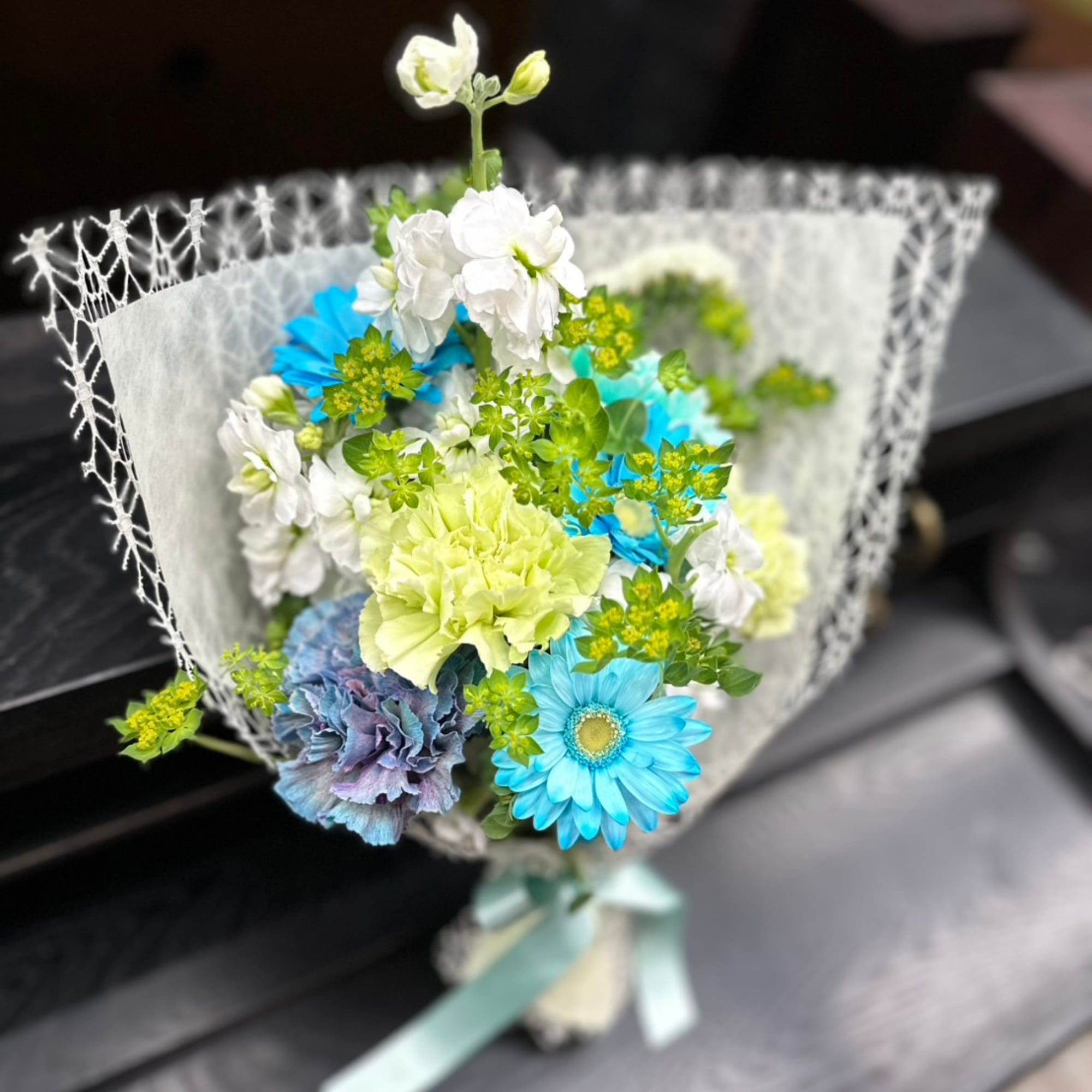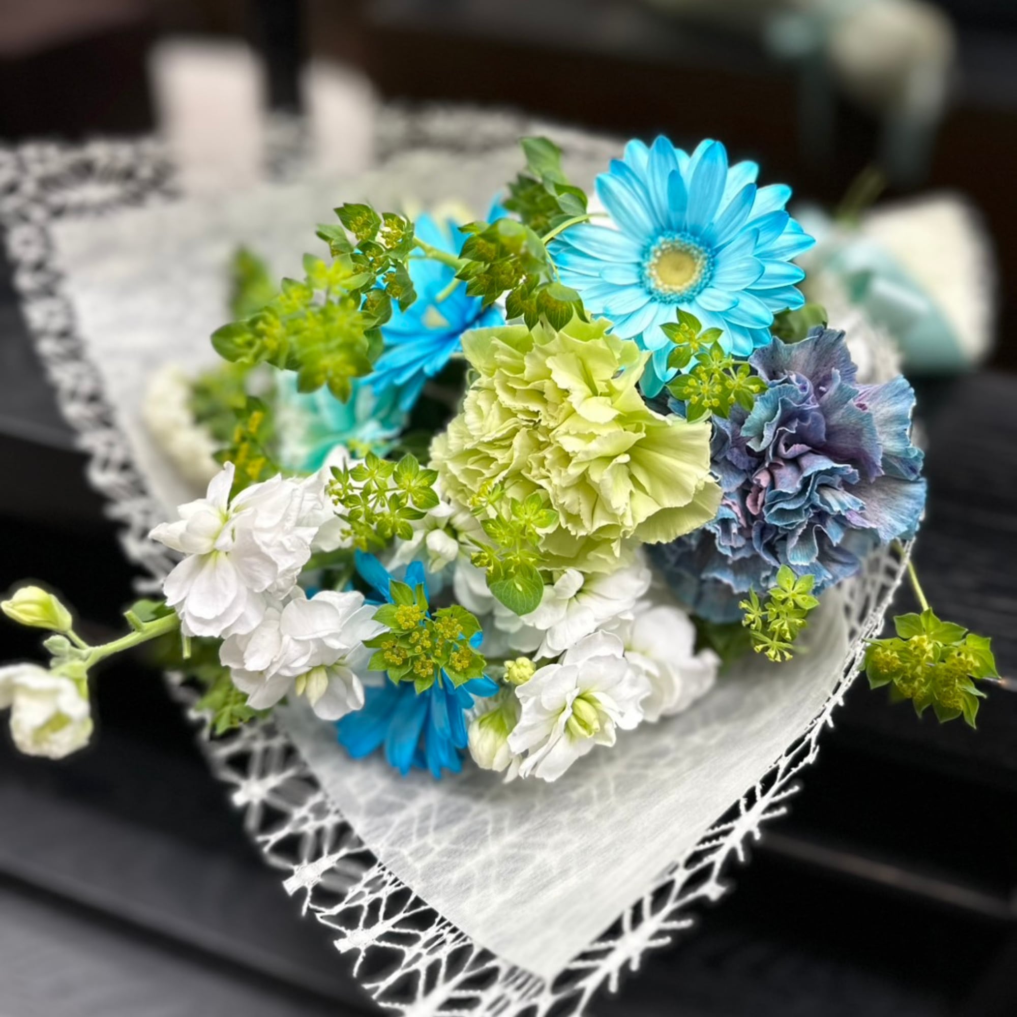 ・ブルーガーベラ、カーネーション、デルファニウム、白いストック、ププレリウムなどで爽やかにまとめたブーケ
