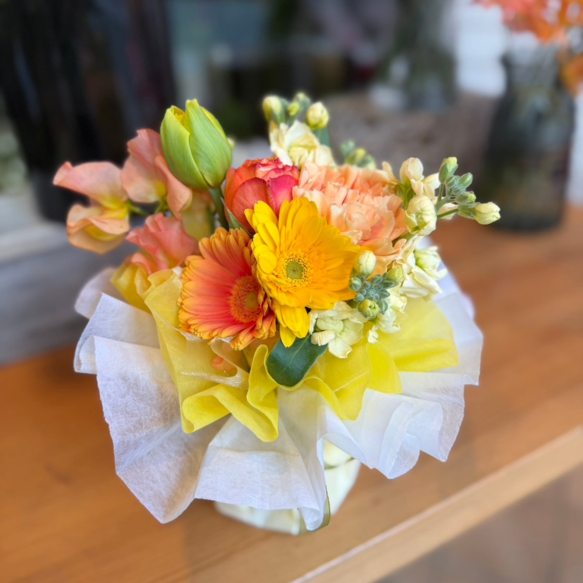 ガーベラやチューリップ、スイートピーなど、春を感じさせる温かみのあるイエロー・オレンジ系のブーケ。明るい気持ちを届けたい時にぴったりです!