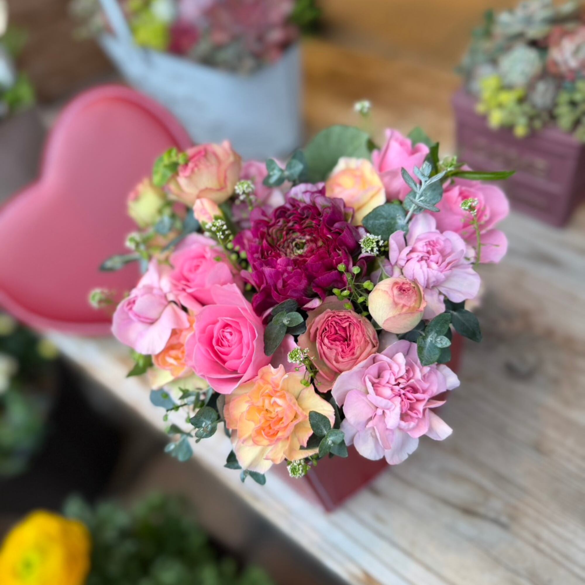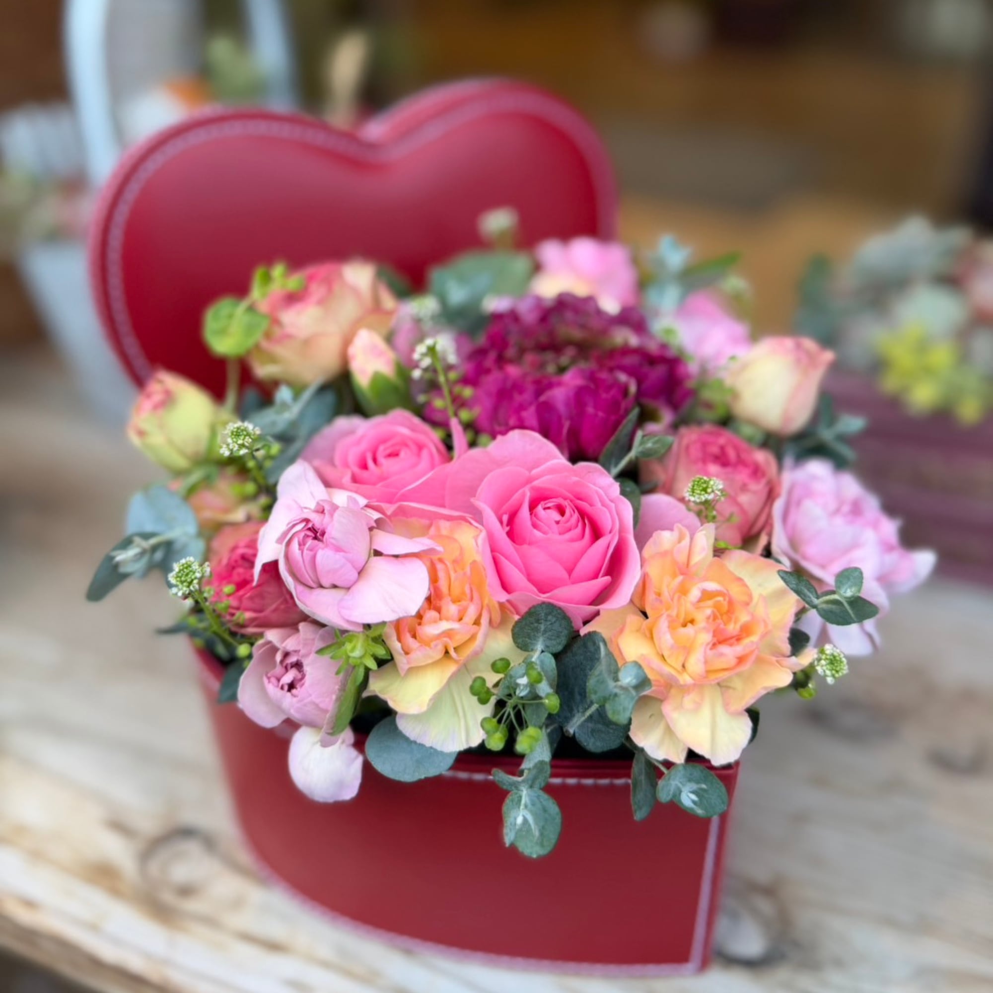 高級感のある真っ赤なハート型レザーボックスに、瑞々しいバラやラナンキュラス、カーネーションを隙間なく詰め込みました。大切な方へ「特別な想い」を届けます。
