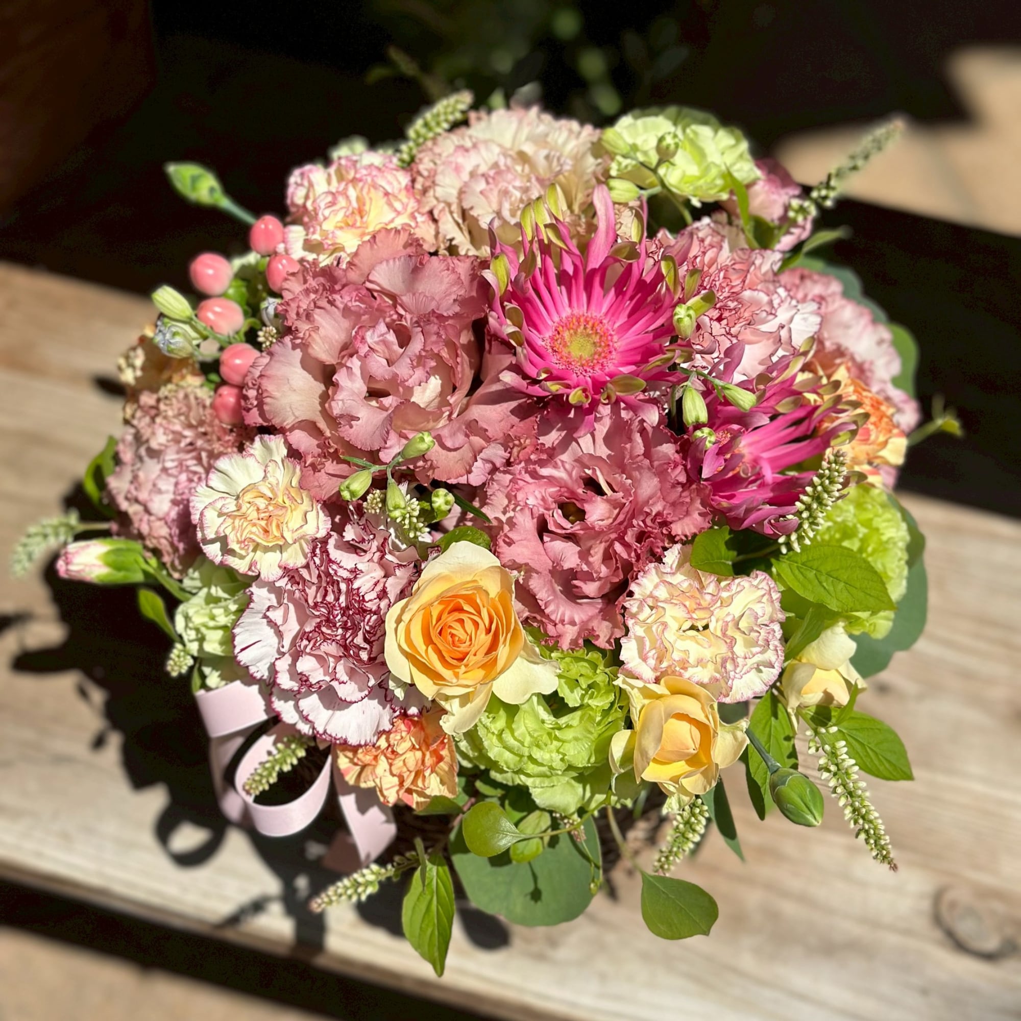 アンティークなニュアンスカラーのトルコキキョウを主役に、柔らかなイエロー系、オレンジ系のバラやカーネーションを添えた豪華な春爛漫アレンジメント。